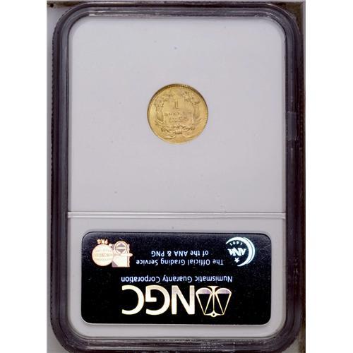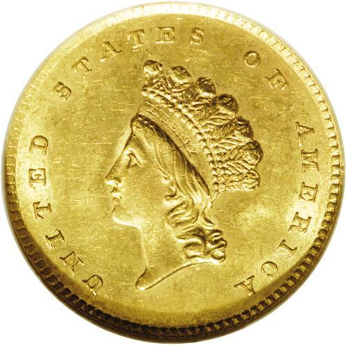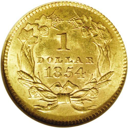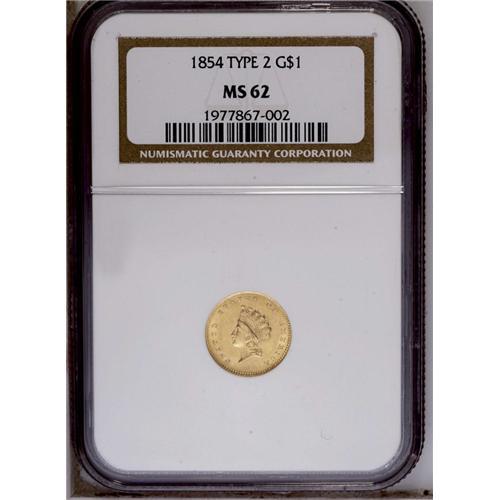 <B>1854<G$1> Type Two MS62 NGC.</B></I> One of the most popular of the gold type coins and always in strong demand from collectors, particularly in mint state grades. The present example is lustrous and well struck, there usual die clashing is not present, quite an event for this series. Apparently a middle die state as the reverse dies shows evidence of lapping, as the corn husk on the right side is weak and shallow in definition. No surface problems distract the eye and a delightful collector coin in every way. <BR><BR><B>Important notice:</B> Heritage usually auctions material at the rate of 200-250 lots per hour. On some occasions eBay Live bid software or the Internet may not be able to keep up with the pace of the auction. We recommend placing a realistic absentee bid now as insurance to avoid disappointment. Occasionally the auctioneer may eliminate or reject an eBay Live bid, and the auctioneer may also reopen a lot after the close of the eBay live bidding (usually because we missed an audience bid), and may reject your bid even if it shows you as the winning bidder. By bidding via eBay Live, you agree that Heritage may award the lot to another bidder at its sole discretion under the circumstances described above or any other reasonable circumstances. Since eBay bids are not shown to us until we open the lot on the floor, we treat those bids just like floor bids. In most cases the floor responds before the eBay bid is presented to us, due to Internet lag time, so for consistency we have made it a policy that floor bids are always considered first over tie eBay live bids. Also please note that all Heritage lots purchased through eBay Live carry a 20% Buyer's Premium. Please make sure you read the Terms and Conditions before you bid. This lot is being auctioned in conjunction with a live floor auction by Heritage Galleries & Auctioneers. All final auction and invoice information will be supplied by Heritage Galleries & Auctioneers, and all other information should be considered preliminary. Lot:2272 <BR><BR><B>Winning Notification and Billing:</B> After the FINAL session in this auction is complete, Heritage will send e-mail and snail mail invoices. This process normally takes several days. All final auction and invoice information will be supplied by Heritage Galleries & Auctioneers, and all other information should be considered preliminary. <BR><BR>This auction will be conducted on a live auction floor and over the Internet through eBay Live. If you choose to place an absentee bid, please take a moment to <font color='#0000ff'><u><a href='http://pages.ebay.com/liveauctions/help/before/laabsentee.html'>learn how eBay Live absentee bidding works</a></u></font><font color='#000000'>