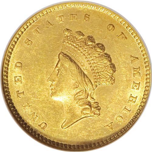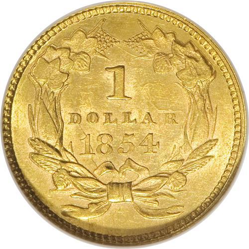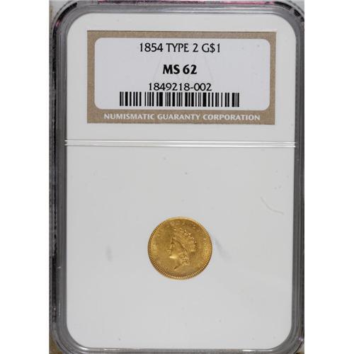 <B>1854 G$1 Type Two MS62 NGC.</B></I> The yellow-gold surfaces of this well-defined representative have glints of orange in the fields. The coin has a clean appearance overall, though wispy marks appear on both sides. Philadelphia was the only Mint to strike Type Two pieces for 1854, though Charlotte, Dahlonega, and New Orleans did so as well in 1855.<BR><BR><b>Shipping:</b> Coins & Currency (<a target="_blank" href="http://www.heritageauctions.com/common/shipping.php">view shipping information</a>)