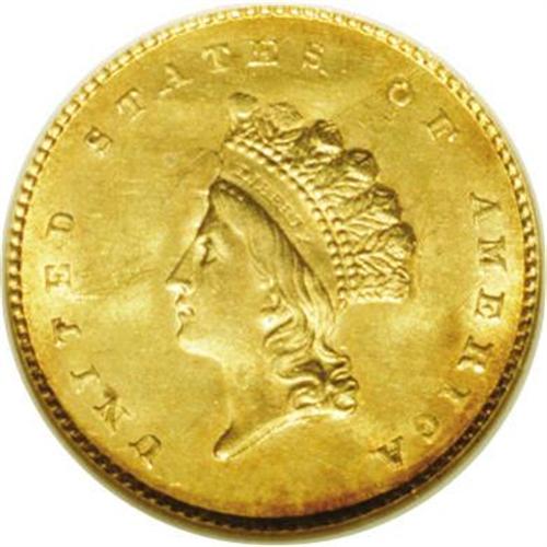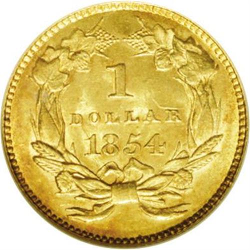<B>1854<G$1> Type Two MS62 NGC.</B></I> This 1854 gold dollar displays flashy sunset-gold surfaces with pleasing luster. The design features are well impressed throughout, though the hair at Liberty's forehead and temple is somewhat soft. A couple of thin scratches are seen in the obverse fields under close examination, otherwise, the surfaces are essentially mark-free. Both sides exhibit noticeable die clashing. All in all, this is an attractive Type Two gold dollar.