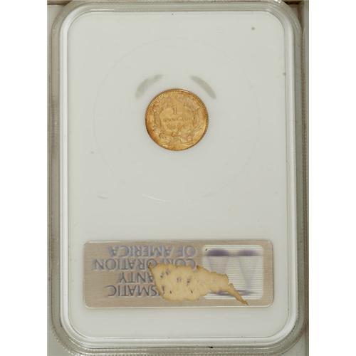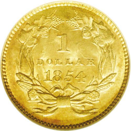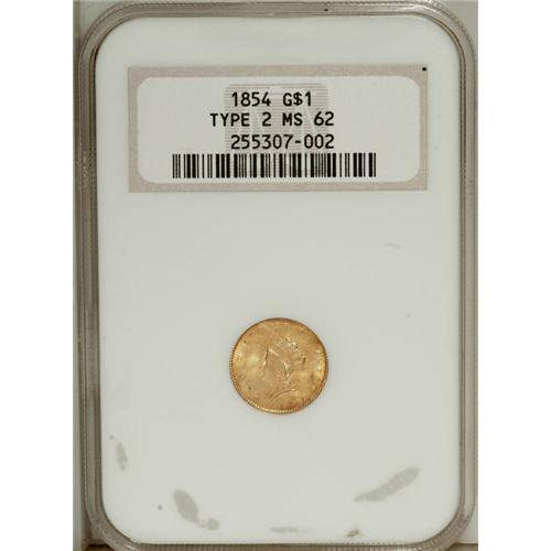 <B>1854<G$1> Type Two MS62 NGC.</B></I> This Type Two gold dollar displays flashy sunset-gold surfaces. The design features are well impressed throughout, particularly on the wreath bow and knot. A few wispy pinscratches are noted in the obverse fields upon close examination, but the portrait and the reverse are unabraded. Both sides exhibit noticeable die clashing. In an early generation NGC holder.
