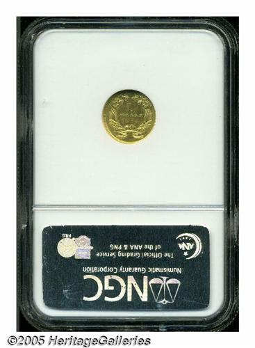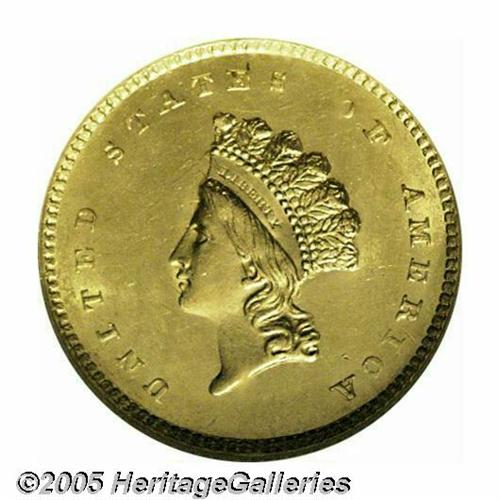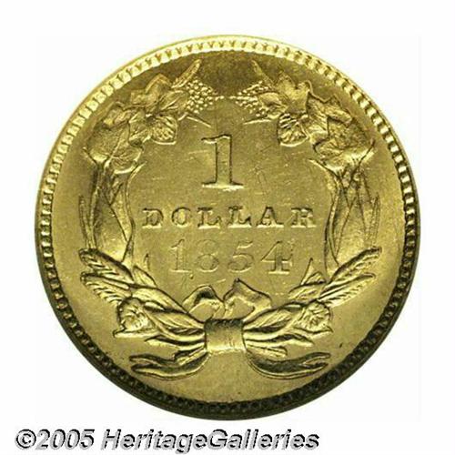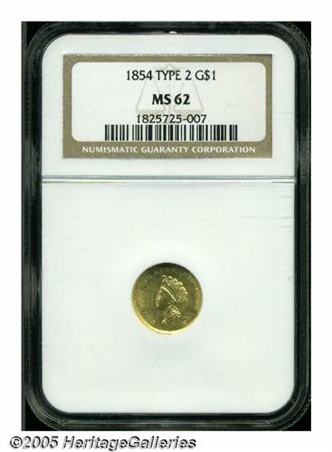 <B>1854<G$1> Type Two MS62 NGC.</B></I> We are pleased to be offering several Mint State representatives of the desirable Type Two Gold Dollar in this sale. The present example, a first-year representative certified by NGC, is awash in rich yellow-gold color. There are a few singularly distractions on the obverse including a diagonal pinscratch across Liberty's head. The strike is exceptionally sharp for the issue with emerging definition on the hair curls over Liberty's brow, but some weakness on the digits of the date. There are clashmarks in the fields around the central design elements that are common for the type.