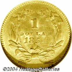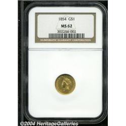 <B>1854<G$1> Type Two MS62 NGC.</B></I> A near-Select quality Type Two Gold Dollar, both sides are above average in striking definition with only minimal softness of detail over the central obverse highpoint. The green-gold surfaces exhibit a couple of scattered abrasions, uncommonly minimal for the assigned grade. <BR><BR><B>Important notice:</B> Heritage usually auctions material at the rate of 200-250 lots per hour. On some occasions eBay Live bid software or the Internet may not be able to keep up with the pace of the auction. We recommend placing a realistic absentee bid now as insurance to avoid disappointment. Occasionally the auctioneer may eliminate or reject an eBay Live bid, and the auctioneer may also reopen a lot after the close of the eBay live bidding (usually because we missed an audience bid), and may reject your bid even if it shows you as the winning bidder. By bidding via eBay Live, you agree that Heritage may award the lot to another bidder at its sole discretion under the circumstances described above or any other reasonable circumstances. Since eBay bids are not shown to us until we open the lot on the floor, we treat those bids just like floor bids. In most cases the floor responds before the eBay bid is presented to us, due to Internet lag time, so for consistency we have made it a policy that floor bids are always considered first over tie eBay live bids. Also please note that all Heritage lots purchased through eBay Live carry a 20% Buyer's Premium. Please make sure you read the Terms and Conditions before you bid. </span></font></tr></table></td></tr></table>