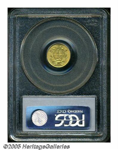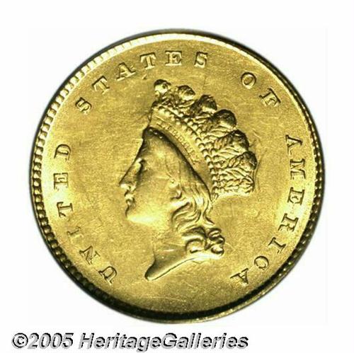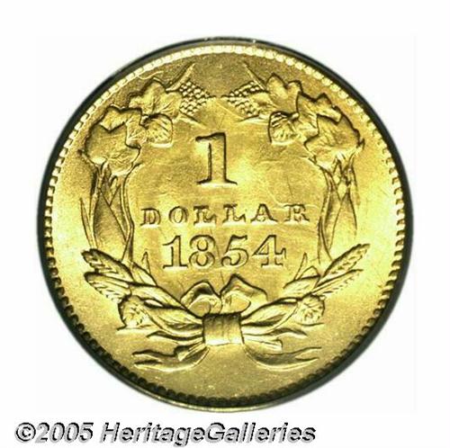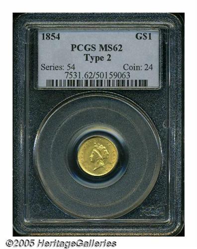 <B>1854<G$1> Type Two MS62 PCGS.</B></I> Brilliant and frosty. Nice eye appeal for the grade. A few scarcely noticeable lines on Liberty's face and hair are probably all that kept PCGS from assigning a substantially higher grade to this beauty. A popular and eagerly sought design type that was coined at the Philadelphia Mint only in the years 1854 and 1855.