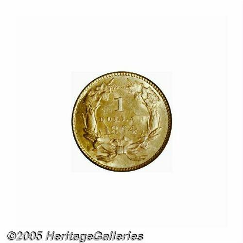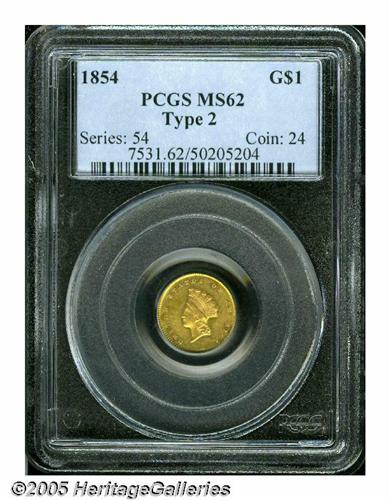<B>1854<G$1> Type Two MS62 PCGS.</B></I> Lustrous and attractive for this popular issue, with light yellow-gold throughout. Both dies show minor clashing, typical for this denomination.