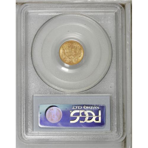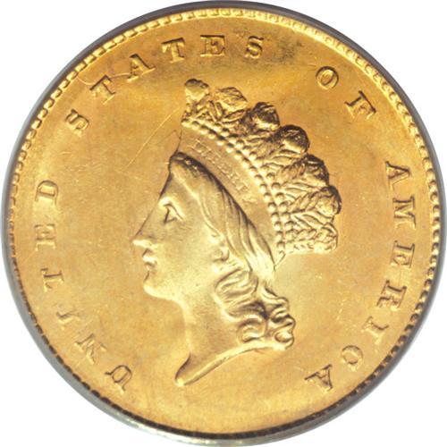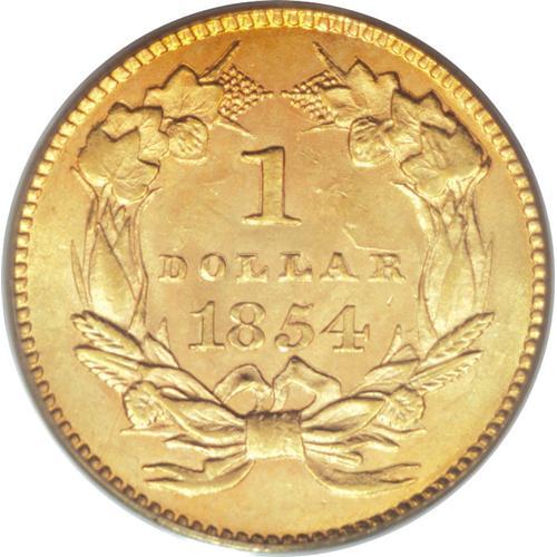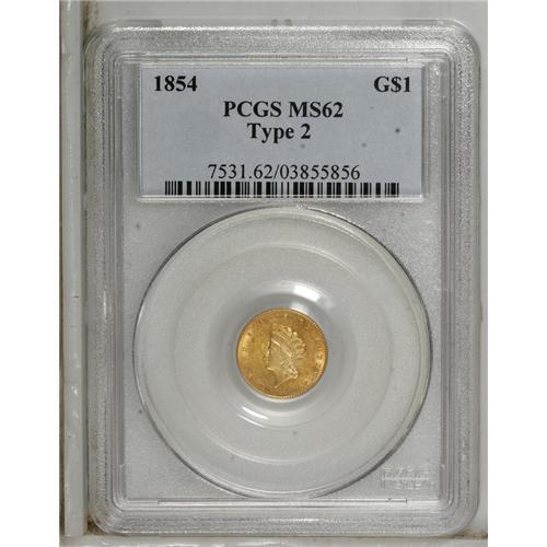 <B>1854 G$1 Type Two MS62 PCGS.</B></I> Orange-gold shadings enrich the obverse, while the reverse has more subtle honey-gold toning. Well struck for the type, with an even impression on DOLLAR and the date, and splendid detail on Liberty's hair curls. Struck from clashed dies, as usual for this coveted and briefly issued type.<BR><BR><b>Shipping:</b> Coins & Currency (<a target="_blank" href="http://www.heritageauctions.com/common/shipping.php">view shipping information</a>)