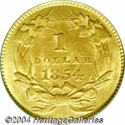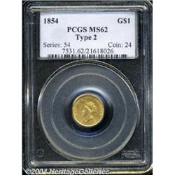 <B>1854<G$1> Type Two MS62 PCGS.</B></I> A lustrous coin with fully original surfaces from the first year of the Type Two Gold Dollars. Usually seen in circulated grades, this Mint State example is bright and well detailed with a touch of typical softness in the centers. Just a few minor blemishes serve to limit the grade. <BR><BR><B>Important notice:</B> Heritage usually auctions material at the rate of 200-250 lots per hour. On some occasions eBay Live bid software or the Internet may not be able to keep up with the pace of the auction. We recommend placing a realistic absentee bid now as insurance to avoid disappointment. Occasionally the auctioneer may eliminate or reject an eBay Live bid, and the auctioneer may also reopen a lot after the close of the eBay live bidding (usually because we missed an audience bid), and may reject your bid even if it shows you as the winning bidder. By bidding via eBay Live, you agree that Heritage may award the lot to another bidder at its sole discretion under the circumstances described above or any other reasonable circumstances. Since eBay bids are not shown to us until we open the lot on the floor, we treat those bids just like floor bids. In most cases the floor responds before the eBay bid is presented to us, due to Internet lag time, so for consistency we have made it a policy that floor bids are always considered first over tie eBay live bids. Also please note that all Heritage lots purchased through eBay Live carry a 20% Buyer's Premium. Please make sure you read the Terms and Conditions before you bid. </span></font></tr></table></td></tr></table>