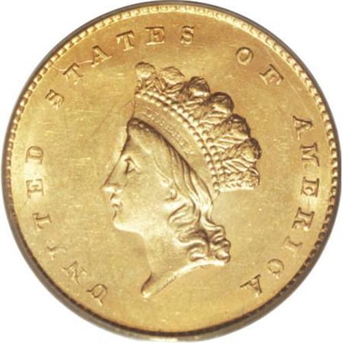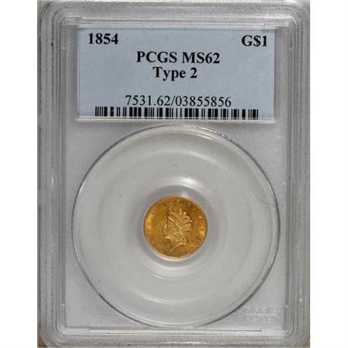 <B>1854 G$1 Type Two MS62 PCGS.</B></I> Orange-gold shadings enrich the obverse, while the reverse has more subtle honey-gold toning. Well struck for the type, with an even impression on DOLLAR and the date and splendid detail on Liberty's hair curls. Lightly marked overall and struck from clashed dies, as usual for this coveted, short-lived gold dollar type.<BR><BR><B>Coin Engraver:</B> James B. Longacre<BR><BR><b>Shipping:</b> Coins & Currency (<a target="_blank" href="http://www.heritageauctions.com/common/shipping.php">view shipping information</a>\)