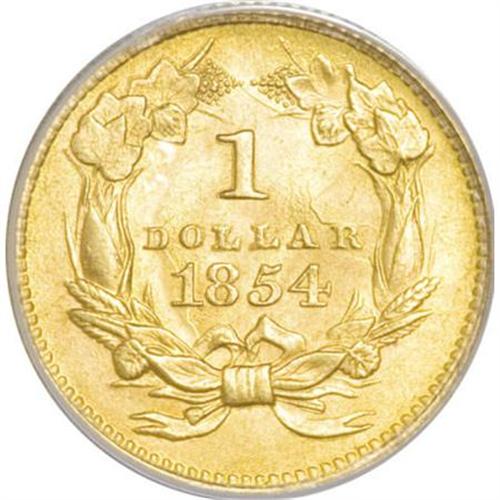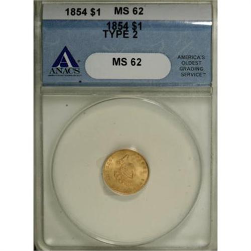 <B>1854 G$1 Type Two MS62 PCGS.</B></I> A wonderful representative of the Longacre small Indian Head gold dollar, also known more generically at the Type Two gold dollar. This piece is highly lustrous with brilliant yellow mint frost and sharp design details. Vastly scarcer than the Type One motif.<BR><BR><B>Coin Engraver:</B> James B. Longacre<BR><BR><b>Shipping:</b> Coins & Currency (<a target="_blank" href="http://www.heritageauctions.com/common/shipping.php">view shipping information</a>)