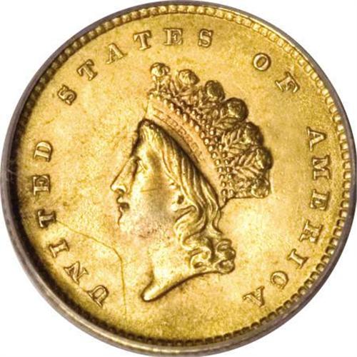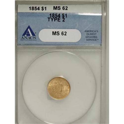 <B>1854 G$1 Type Two MS62 ANACS.</B></I> A wonderful representative of the Longacre small Indian Head gold dollar, also known more generically at the Type Two gold dollar. This piece is highly lustrous with brilliant yellow mint frost and sharp design details. Vastly scarcer than the Type One motif.<BR><BR><B>Coin Engraver:</B> James B. Longacre<BR><BR><b>Shipping:</b> Coins & Currency (<a target="_blank" href="http://www.heritageauctions.com/common/shipping.php">view shipping information</a>)