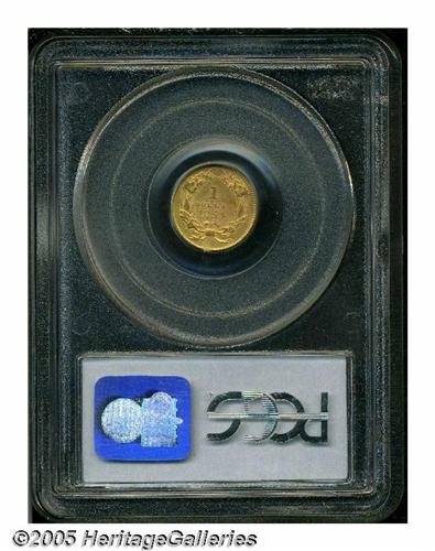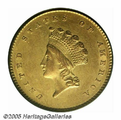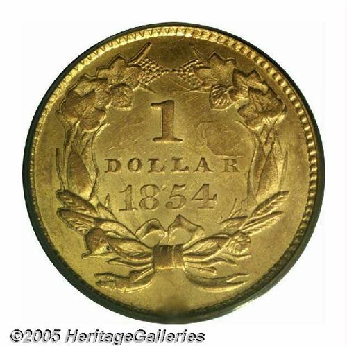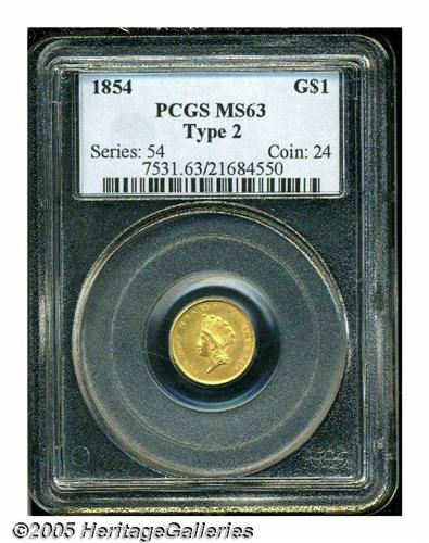 <B>1854<G$1> Type Two MS63 PCGS.</B></I> After Treasury Secretary Guthrie approved the redesign for the gold dollar on August 18, 1854, coinage commenced the following day. Issues were brief and limited, but apparently the public noticed enough differences between the previous design and this one that numerous high grade examples were set aside. This is a particularly well struck example that displays even, deep reddish patina over each side. Lightly die clashed.