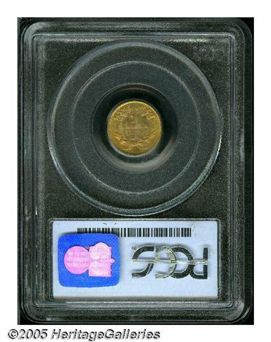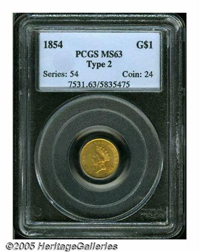 <B>1854<G$1> Type Two MS63 PCGS.</B></I> James Longacre was neither a competent engraver nor one with much imagination. His modified head for the Type Two gold dollar was a design that he used in various versions of U.S. coinage, in no fewer than 15 variations, from the Indian cent to double eagle. The Type Two gold dollar most closely resembles the three dollar gold piece in immediacy of design. The weakness of detail that this issue is widely known for is conspicuously absent on this lovely Mint State example. Additionally, the surfaces display vivid reddish-golden and lilac coloration with no obvious marks, just the usual die clashing that is common to almost all gold dollars of this type.