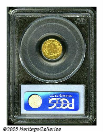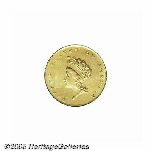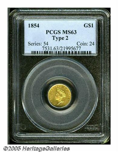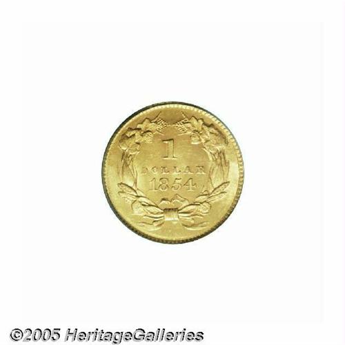 <B>1854<G$1> Type Two MS63 PCGS.</B></I> Shimmering luster bathes this pleasing straw-gold type coin. The major devices are well struck, and any softness of strike is limited to the left side margins. A few faint slide marks are not relevant for the grade. Clash marks are light, and are limited to the field behind Liberty's head. Die lapping (as made) has removed some details from the wreath bow, the neck curls, and the top of the Y in LIBERTY. Although 1854 and 1855 Type Two Gold Dollars are not rare, they are scarce in Select Mint State, and are significant as a short-lived gold type.