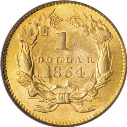 <B>1854 G$1 Type Two MS63 PCGS.</B></I> Because the Small Indian head design was only minted from 1854 to 1856, it is considered an important type issue, resulting in heightened demand. The Philadelphia Mint coined about 1.5 million of these coins in 1854 and 1855, a substantial decrease from earlier years. From 1849 through 1853, the average annual production in Philadelphia was about 2 million gold dollars per year.<BR> Frosty surfaces and highly lustrous yellow-gold are evident on both sides of this lovely Mint State piece. Hints of pale orange and wispy blue toning are visible on both sides. The strike is sharp, and nearly full at the centers, atypical for the design.<BR><BR><B>Coin Engraver:</B> James B. Longacre<BR><BR><b>Shipping:</b> Coins & Currency (<a target="_blank" href="http://www.heritageauctions.com/common/shipping.php">view shipping information</a>)