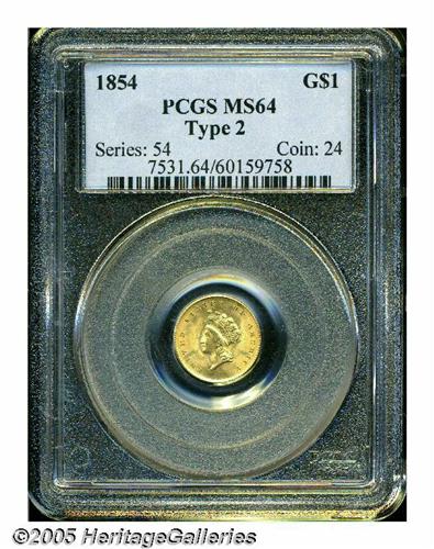 <B>1854<G$1> Type Two MS64 PCGS.</B></I> The briefly minted Type Two Gold Dollar is anything but scarce in About Uncirculated condition, but is by far the most challenging of the major gold types from 1850 forward in better Mint State grades. This Choice representative is far and away nicer than the typical Uncirculated survivor. Unavoidable die clashing is visible on both sides, but does not consume the viewer and the coin is very well detailed for this often mushy type. Both sides display a smooth, satiny finish beneath a thin veil of honey-gold patina.
