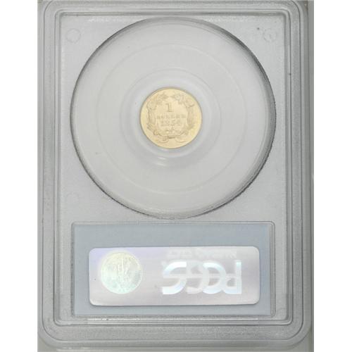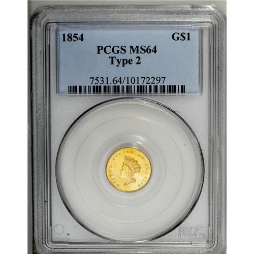 <B>1854<G$1> Type Two MS64 PCGS.</B></I> The lemon-yellow surfaces are awash in brilliant luster on each side. Extensive examination under a loupe reveals only the most minute contact marks in the fields. The strike is well executed, with bold detail on the headdress-feather tops and the peripheral legends. Some crumbling is noted on the obverse rim. An apparent reverse die defect has produced an extra near-vertical line to the right of the ear of corn. The Type Two gold dollars are widely known to be among the most difficult gold types to find in high Mint State grades.