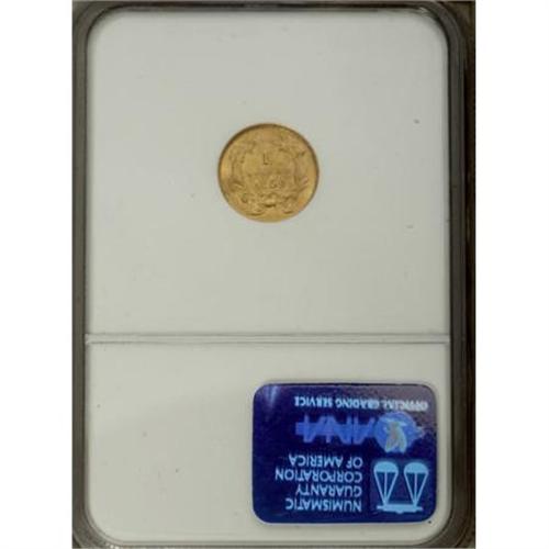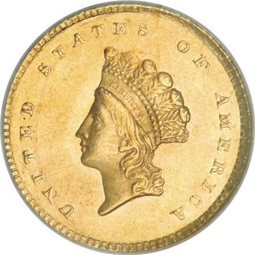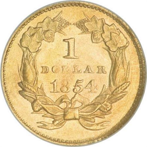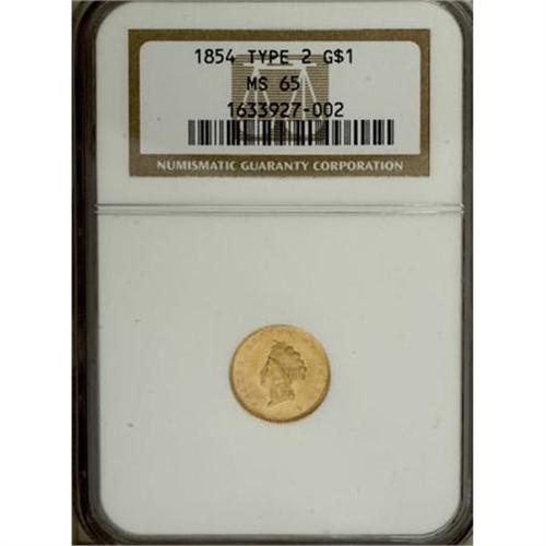 <B>1854 G$1 Type Two MS65 NGC.</B></I> The 1854 Indian Head gold dollar (Type Two), with a mintage approaching 800,000 pieces, is common by most measures. This becomes evident upon perusing the NGC/PCGS population figures, showing several thousand examples in all grades. The Gem population drops precipitously, however, with roughly 100 coins certified.<BR> Vibrant, swirling luster embraces this MS65 specimen. Attractive yellow-gold patina graces both sides, and the design elements exhibit a somewhat better strike than is usually seen on the issue. Still, minor softness is apparent in the hair at the forehead, on the OL of DOLLAR, and the upper part of the 8 in the date. A few unobtrusive handling marks are all that stand in the way of this lovely piece achieving an even finer grade. Census: 29 in 65, 11 finer (11/07).<BR><I>From The Florissant Collection.</B></I><BR><BR><B>Coin Engraver:</B> James B. Longacre<BR><BR><b>Shipping:</b> Coins & Currency (<a target="_blank" href="http://www.heritageauctions.com/common/shipping.php">view shipping information</a>)