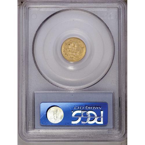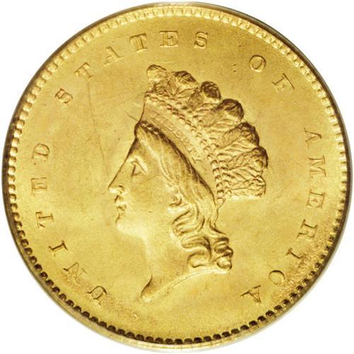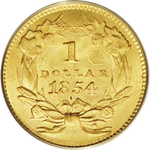 <B>1854<G$1> Type Two MS65 PCGS.</B></I> Breen-6037. This is an impressive Gem quality Mint State example of the debut coinage issue for the short-lived Type Two or Small Indian Head design. All design features are boldly detailed, with frosty and bright yellow luster. Although Longacre's design is certainly appealing, it was not well thought out from a production standpoint, with the central obverse and reverse rarely fully struck. Not only is this an important example from the quality viewpoint, but it is a splendid example of the extremely rare doubled die obverse variety, with a tripled row of beads above Liberty's headband, and numerous letters in the legend doubled as well.