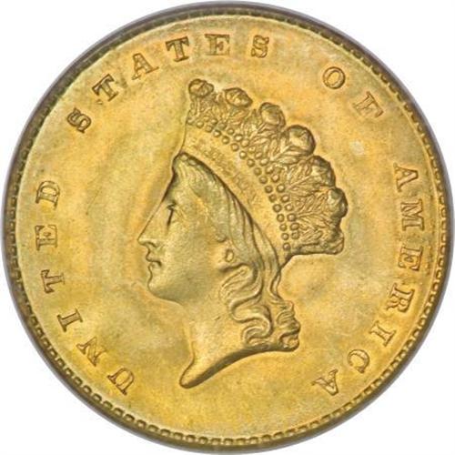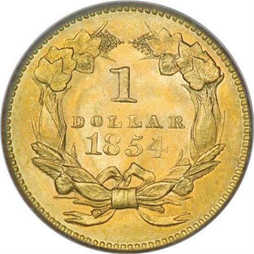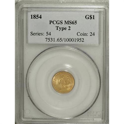 <B>1854 G$1 Type Two MS65 PCGS.</B></I> The Type Two gold dollar, featuring an "Indian Princess" Small Head, was minted from 1854 to 1856. The 1854 (coined only at the Philadelphia Mint), with a mintage of 783,943 pieces, is an important type coin. Paul Taglione, in his reference work on U.S. federal gold coinage, writes:<BR><BR>"The demand for short-lived and distinctive Type coinage over the past several decades has obscured the fact that the 1854 Type II Philadelphia issue is actually one of the more common of all Gold Dollars. It can be easily acquired in all grades up to Mint State-60 and even Mint State-65 examples are available with patient search."<BR><BR> Taglione's comments on MS65 examples notwithstanding, the Gem in this lot is <I>exceptional</B></I>, in that it bears a much better-than-average strike for an issue, and type, that is plagued by poor central definition. The Indian's bonnet displays excellent detail, as do all the letters in DOLLAR and digits in the date, and all elements of the wreath. Only the hair reveals minor softness at the temple. The patina is outstanding, a delicate mix of apricot-gold and mint-green. Vibrant luster adorns both sides, each of which has been well cared for. Were it not for a few inoffensive obverse handling marks, this magnificent coin would have an even higher grade. Population: 50 in 65, 11 finer (11/07).<BR><I>From The Madison Collection.</B></I><BR><BR><B>Coin Engraver:</B> James B. Longacre<BR><BR><b>Shipping:</b> Coins & Currency (<a target="_blank" href="http://www.heritageauctions.com/common/shipping.php">view shipping information</a>)