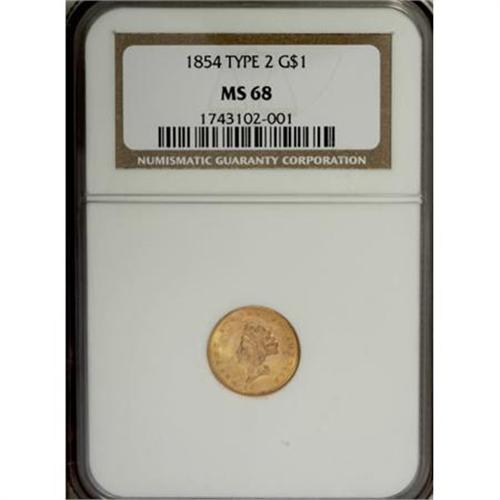 <B>1854 G$1 Type Two MS68 NGC.</B></I> The Small Head Type Two gold dollar is a notoriously scarce type. It was struck for only three years, with the final year of production limited to a tiny San Francisco emission. San Francisco was late in the game due to the geographic distance between the two coasts. Each of the other three branch mints then in operation, Charlotte, Dahlonega, and New Orleans, struck a small number of Type Two pieces in 1855.<BR> Due to the cost and scarcity of the branch mint issues, most type collectors choose either the 1854 or 1855 Philadelphia dates. Their mintages are similar, separated by only 25,674 pieces, and they trade at equivalent levels. The 1854 mintage of 783,943 pieces compares favorably with the more than 4 million pieces struck in 1853. Undoubtedly, the reason for the much smaller production is related to the heavy mintage of silver half dimes through half dollars in 1853.<BR> Silver coins had nearly vanished from circulation by 1853, since their bullion value exceeded face. The traditional silver to gold ratio was affected by the large quantities of gold recovered from California mining camps. Gold coins continued to circulate, while silver coins were hoarded by speculators. As the lowest denomination gold coin, the gold dollar was needed in commerce to fill the gap caused by silver's absence.<BR> Like the silver three cent piece, the gold dollar was essential to commerce when there was little alternative. But in 1853, the weight of the Seated Liberty denominations was reduced, with the exception of the silver dollar. Once again their face value exceeded their value as bullion, and the half dime, dime, quarter, and half dollar returned to circulation. Mintages of the half dime, dime, and quarter broke records in 1853. Production of the half dollar was at a ten-year high.<BR> The flood of silver coinage reduced the need for the gold dollar, which was unpopular in any event because its small diameter made it easy to lose. To combat this problem, the Type Two's diameter is 15 mm, slightly greater than the 13 mm Type One.<BR> In the 19th century, it was Mint policy to limit designs, preferably one per alloy. The half cent and cent, the half dime and dime, the quarter and half dollar, and the quarter eagle through eagle had similar designs. But the three dollar gold piece, introduced in 1854, was similar in value to the quarter eagle, and needed distinctive motifs. The increased diameter Type Two gold dollar needed new designs, and it was natural to re-use the wreath and layout of the approved three dollar.<BR> Mint officials likely regretted their decision to create a new bust of Liberty for the Type Two obverse. Longacre's Small Head was in high relief, causing metal to flow into the portrait and away from the corresponding area of the reverse. Thus, DOLLAR and the date are nearly always weak on Type Two gold dollars. This problem was alleviated in 1856, when the Small Head was scrapped in favor of the Large Head conveniently taken from the three dollar design.<BR> The two-year, relatively small Type Two mintage at Philadelphia led to the rarity of this gold type. In 1854 and 1855, there were few collectors, even on the East coast. As a store of value, gold dollars were set aside, but rarely was its condition of any concern. It is remarkable, then, that a few high grade Mint State examples have survived. PCGS has yet to grade any Type Two dollars above the MS67 level, and NGC has certified just two pieces as MS68 with none finer. Both coins are 1854 Philadelphia examples. One of them is the Eliasberg piece, auctioned in October 1982 and again in July 2002. <BR> The other MS68 example is the present lot. As one would expect from its remarkable grade, it is completely unabraded. A small smudge on the holder at 12 o'clock on the obverse has no impact on the coin itself. The coin is currently being reholdered to remove the smudge. Minor planchet granularity near the UNI in UNITED is as made. The strike is crisp, particularly for the type, with minor incompleteness on the left-side denticles and a whisper of softness on the LL in DOLLAR and the 8 in the date. Here is a miracle, a coin that appears just as it did when it left the dies more than a century and a half ago, despite the fact that it was struck for circulation instead of a collector's cabinet. We can only thank the alert antebellum individual that recognized its importance and immediately set it aside for posterity. Norman Stack described the present piece in 1986 as "a pristine specimen, probably without its equal. ... We will grade this incredible coin Mint State-70. The coin is exactly as it left the dies 130 years ago." Census: 2 in 68, 0 finer (1/08).<BR><I>Ex: James Walter Carter & Margaret Woolfolk Carter Collections (Stack's, 1/86), lot 29; Auction '89 (David W. Akers, 7/89), lot 1341; American Numismatic Rarities, 7/03, lot 624.</B></I><BR><I>From The Southwest Collection.</B></I><BR><BR><B>Coin Engraver:</B> James B. Longacre<BR><BR><b>Shipping:</b> Coins & Currency (<a target="_blank" href="http://www.heritageauctions.com/common/shipping.php">view shipping information</a>)<BR><BR><B>Important notic