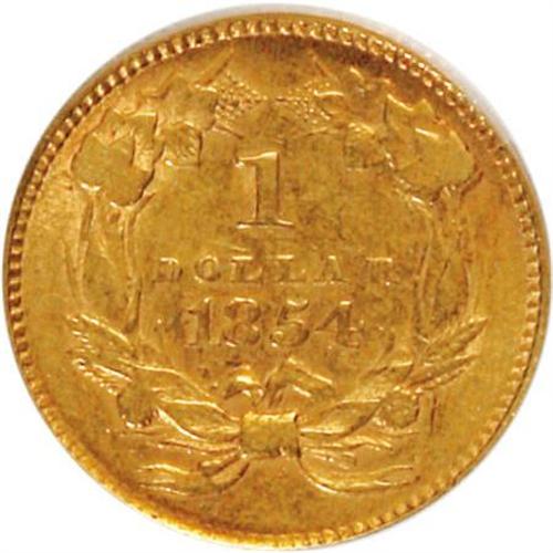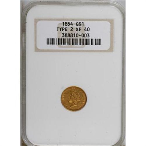 <B>1854 G$1 Type Two XF40 NGC.</B></I> NGC Census: (48/4456). PCGS Population (128/2784). Mintage: 783,943. Numismedia Wsl. Price for NGC/PCGS coin in XF40: $375. (#7531)<BR><BR><B>Coin Engraver:</B> James B. Longacre<BR><BR><b>Shipping:</b> Coins & Currency (<a target="_blank" href="http://www.heritageauctions.com/common/shipping.php">view shipping information</a>)