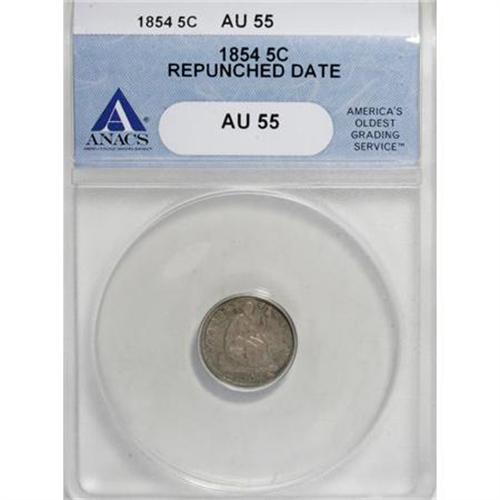 <B>1854 H10C Arrows--Repunched Date--AU55 ANACS.</B></I> . NGC Census: (14/451). PCGS Population (31/316). Mintage: 5,740,000. Numismedia Wsl. Price for NGC/PCGS coin in AU55: $135. (#4358)<BR><I>From The Al Blythe Collection of Half Dimes.</B></I><BR><BR><B>Coin Engraver:</B> Christian Gobrecht<BR><BR><b>Shipping:</b> Coins & Currency (<a target="_blank" href="http://www.heritageauctions.com/common/shipping.php">view shipping information</a>)