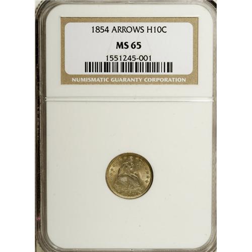 <B>1854 H10C Arrows MS65 NGC.</B></I> An appealing Gem example of this three-year variety, solidly struck from significantly clashed dies. Highly lustrous and toned red, gold, and green. Census: 50 in 65, 20 finer (12/06).<BR><BR><b>Shipping:</b> Coin/Currency (<a target="_blank" href="http://www.heritageauctions.com/common/shipping.php">view shipping information</a>)