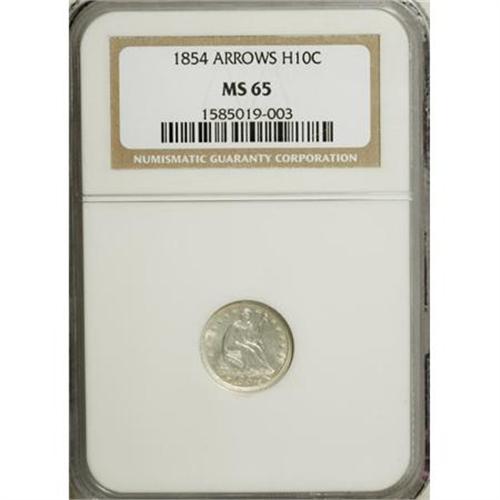 <B>1854 H10C Arrows MS65 NGC.</B></I> A crisply struck example of this popular Arrows issue, strongly lustrous with essentially untoned surfaces. Occasional hints of gold-orange toning visit the lower obverse margin. Population: 37 in 65, 9 finer (3/08).<BR><BR><B>Coin Engraver:</B> Christian Gobrecht<BR><BR><b>Shipping:</b> Coins & Currency (<a target="_blank" href="http://www.heritageauctions.com/common/shipping.php">view shipping information</a>)
