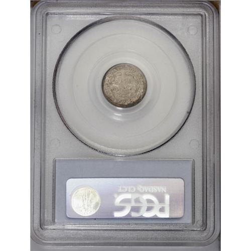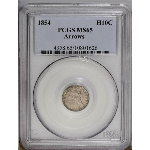 <B>1854<H10C> Arrows MS65 PCGS.</B></I> A well struck and shimmering dove-gray Gem with undisturbed, original surfaces. Clashed, as usual for this high mintage issue. Arrows pieces from the half dime to the half dollar were struck in quantity to replace hoarded old tenor silver coinage. Population: 35 in 65, 8 finer (3/06). <BR><BR><B>Important notice:</B> Heritage usually auctions material at the rate of 200-250 lots per hour. On some occasions eBay Live bid software or the Internet may not be able to keep up with the pace of the auction. We recommend placing a realistic absentee bid now as insurance to avoid disappointment. Occasionally the auctioneer may eliminate or reject an eBay Live bid, and the auctioneer may also reopen a lot after the close of the eBay live bidding (usually because we missed an audience bid), and may reject your bid even if it shows you as the winning bidder. By bidding via eBay Live, you agree that Heritage may award the lot to another bidder at its sole discretion under the circumstances described above or any other reasonable circumstances. Since eBay bids are not shown to us until we open the lot on the floor, we treat those bids just like floor bids. In most cases the floor responds before the eBay bid is presented to us, due to Internet lag time, so for consistency we have made it a policy that floor bids are always considered first over tie eBay live bids. Also please note that all Heritage lots purchased through eBay Live carry a 20% Buyer's Premium. Please make sure you read the Terms and Conditions before you bid. This lot is being auctioned in conjunction with a live floor auction by Heritage Galleries & Auctioneers. All final auction and invoice information will be supplied by Heritage Galleries & Auctioneers, and all other information should be considered preliminary. Lot:1890 <BR><BR><B>Winning Notification and Billing:</B> After the FINAL session in this auction is complete, Heritage will send e-mail and snail mail invoices. This process normally takes several days. All final auction and invoice information will be supplied by Heritage Galleries & Auctioneers, and all other information should be considered preliminary. <BR><BR>This auction will be conducted on a live auction floor and over the Internet through eBay Live. If you choose to place an absentee bid, please take a moment to <font color='#0000ff'><u><a href='http://pages.ebay.com/liveauctions/help/before/laabsentee.html'>learn how eBay Live absentee bidding works</a></u></font><font color='#000000'>