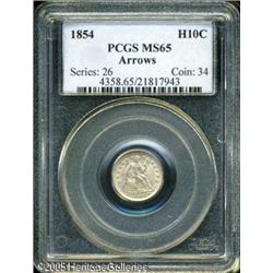 <B>1854 H10C Arrows MS65 PCGS.</B></I> The popular With Arrows type was a limited design issued only from 1853 to 1855. Light gold toning over frosty silver surfaces provide plenty of eye appeal. This Gem example is quite sharply struck, despite being from a late die state with extensive die wear visible in the obverse and reverse fields. Population: 31 in 65, 8 finer (1/05). Lot:6134