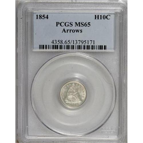 <B>1854 H10C Arrows MS65 PCGS.</B></I> Though the 1854 has less than half the mintage of the 1853, the former is similarly suitable for the type collector. This well struck and shining Gem is predominantly silver-white with hints of ice-blue. The large date's final two digits run into Liberty's base. Population: 39 in 65, 9 finer (8/07).<BR><BR><B>Coin Engraver:</B> Christian Gobrecht<BR><BR><b>Shipping:</b> Coins & Currency (<a target="_blank" href="http://www.heritageauctions.com/common/shipping.php">view shipping information</a>)