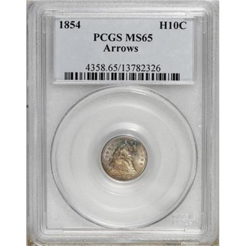 <B>1854 H10C Arrows MS65 PCGS.</B></I> The upper left obverse shows lovely aqua-blue and rose patina, while the lower obverse and parts of the reverse exhibit peach accents. A solidly struck and highly lustrous Gem example of the short-lived Arrows type. Struck from rotated dies. Population: 38 in 65, 9 finer (10/07).<BR><BR><B>Coin Engraver:</B> Christian Gobrecht<BR><BR><b>Shipping:</b> Coins & Currency (<a target="_blank" href="http://www.heritageauctions.com/common/shipping.php">view shipping information</a>)