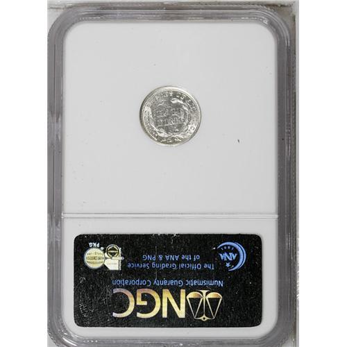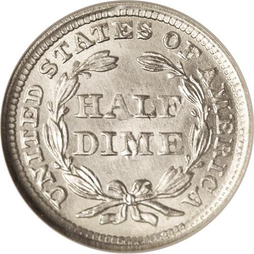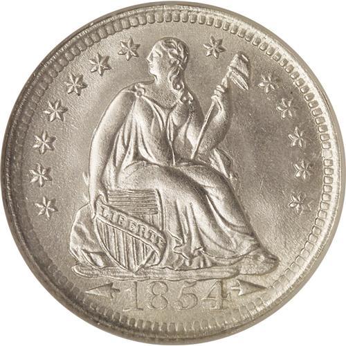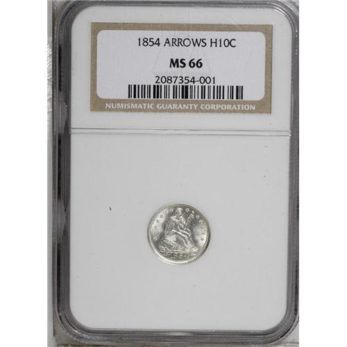 <B>1854<H10C> Arrows MS66 NGC.</B></I> The mintage of the 1854 Arrows half dime was 5.74 million pieces, a tremendous number of coins and unprecedented except for the previous year's output. This stepped-up production, of course, was initiated to place these coins in circulation, something that was spotty at best prior to the Mint Act of 1853. A relatively large number of examples were set aside as curiosities, as they had a noticeable design difference with the arrowheads at each side of the date. However, there are far fewer high grade examples than collectors of high grade 19th century type. This is especially true at the MS66 grade level. Only 14 other pieces have been so graded by NGC with a mere three coins in higher grade (none are finer at PCGS). This piece has snow-white surfaces and thick mint frost that immediately grabs the viewer's attention. Die erosion around the margins gives the coin a matte-like appearance also. Essentially perfect surfaces with the only flaw being slight striking softness over the A in HALF on the reverse.
