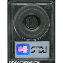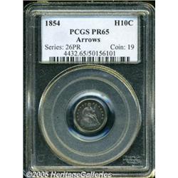 <B>1854 H10C Arrows PR65 PCGS.</B></I> Struck from the V-2 dies, from which all proofs are known. An unknown, but obviously small, number of proofs were produced in 1854. In his 1977 work on proofs, Breen estimated that 16-20 separate pieces were extant today, and he listed the pedigrees of seven specimens. That estimate may actually be somewhat high as 27 pieces have been certified to date by both major services, many of these being likely resubmissions. It may well be that some first strike business strikes have in the past been considered proofs, thus inflating Breen's estimate from 28 years ago.<BR> The rarity and importance of any Arrows coinage in proof would be difficult to overstate. There are many collectors of 19th century proofs, and there are very few unquestioned proof strikings from these key years. The result, of course, is predictable--very high prices for the few known proofs. The fields of this piece appear somewhat shallowly mirrored at first glance, but closer examination reveals that this is appearance only. Both sides are deeply toned in shadings of sea-green and argent-gray, this intermingling of deep coloration subduing the mirrored flash of the fields somewhat. There are no mentionable flaws, lintmarks, or spots that can be mentioned for pedigree purposes. A most attractive Gem proof specimen. Population: 4 in 65, 1 finer (1/05).