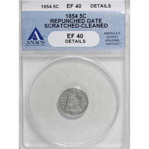 <B>1854 H10C Arrows--Cleaned, Repunched Date, Scratched--ANACS XF40 Details.</B></I> NGC Census: (2/472). PCGS Population (4/384). Mintage: 5,740,000. Numismedia Wsl. Price for NGC/PCGS coin in XF40: $47. (#4358)<BR><I>From The Al Blythe Collection of Half Dimes.</B></I><BR><BR><B>Coin Engraver:</B> Christian Gobrecht<BR><BR><b>Shipping:</b> Coins & Currency (<a target="_blank" href="http://www.heritageauctions.com/common/shipping.php">view shipping information</a>)