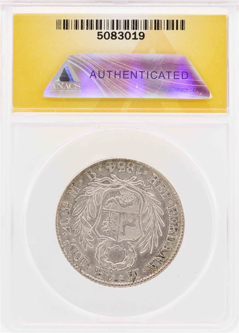 One 1854-L Peru Assayer MB 4 Real Coin ANACS AU50. ANACS Certified.