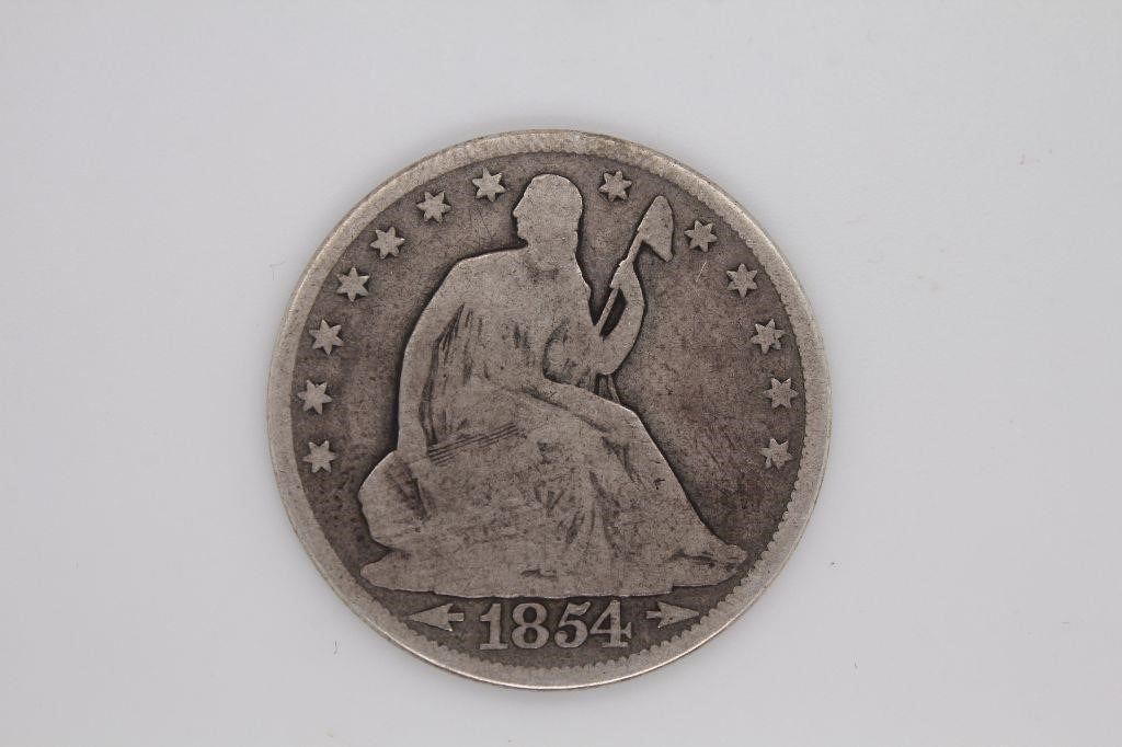 1854 LIBERTY SEATED HALF DOLLAR in VG. Nice coin.