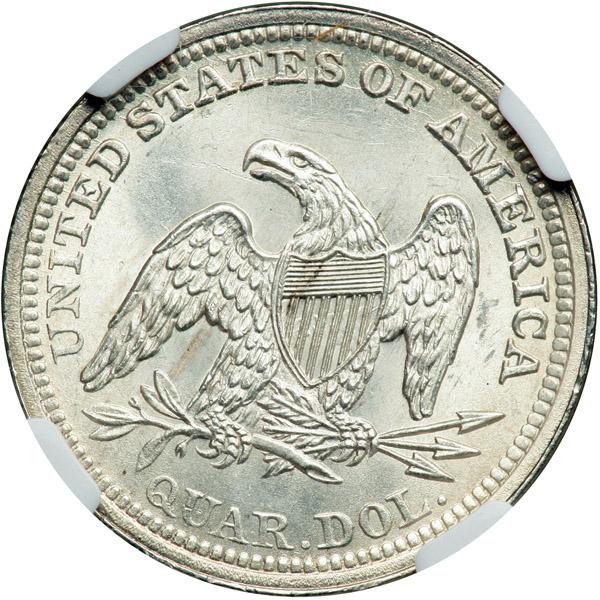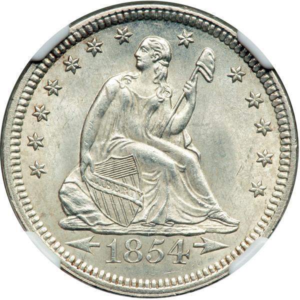 1854 Liberty Seated Quarter Dollar. Arrows. NGC graded MS-65. A silvery bright and frosty specimen glowing with original mint bloom. That said, now we'd be remiss if we didin't cover the strike: this coin, unlike many With Arrows pieces, 1853-55, was struck with the correct scientific precision on the main elements to advance it ahead of the pack.Pop 17; 6 finer, 3 in 66, 3 in 67.