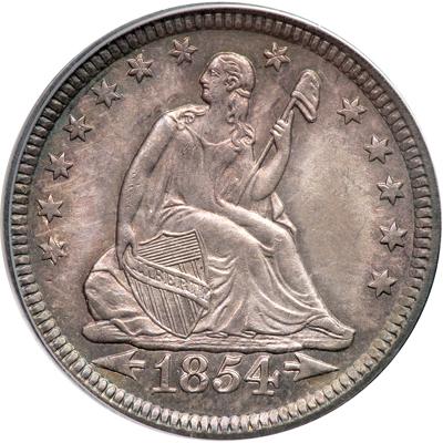 1854 Liberty Seated Quarter Dollar. Arrows. PCGS graded MS-64. Nice even toning on both sides. Frosted mint luster characterizes the surfaces on this lovely toned piece. Excellent detail with perhaps minor weakness to the stars and some rim dentils. The mint was busy in 1853 and 1854 recoining the "old tenor" coins that had been withdrawn from circulation and melted pursuant to the Coinage Act of 1853. Twenty years after this another Coinage Act (that of 1873) would cause a similar issue of With Arrows pieces. Pop 64; 21 finer; 10 in 65; 6 in 66; 5 in 67. (PCGS # 5432).