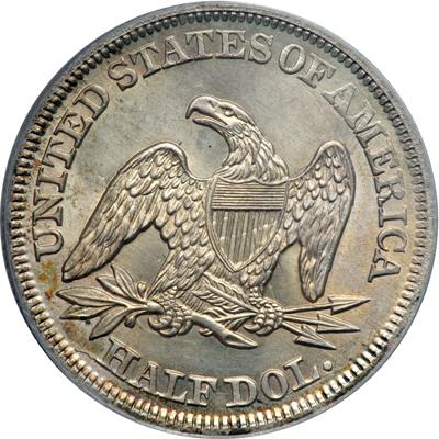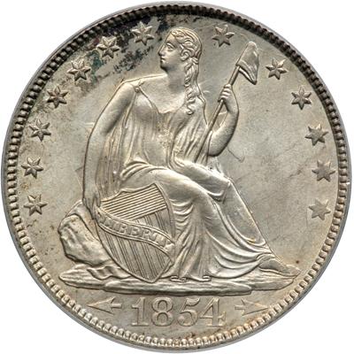 1854 Liberty Seated Half Dollar. Arrows. PCGS graded MS-64 PQ. Well struck with nice even toning. A frosty coin with strong underlying luster from the dies that reinforce the beauty of the sharp design (including two full shields, complete hair on the head and across Liberty's shoulder, full neck and wing feathers on the eagle, etc. Perhaps some might point to the last few stars on the right along with Liberty's foot as not being 100% there, but that is hypercritical. The coin is, pure and simple, a real "looker." Pop 31; 10 finer, 4 in 65, 6 in 66 (PCGS # 6279).