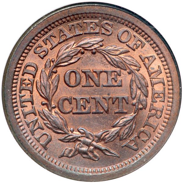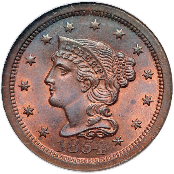 1854 N-10 R2+ NGC graded MS66 Red & Brown. NGC graded MS-66 Red & Brown. Very attractive mint red fading to bluish steel brown with two-thirds of the mint color remaining, mostly on the reverse. This cent is a sharply struck gem except for a dull, very shallow nick in the hair between stars 7 & 8 and a faint spot of darker toning in the field left of star 11. Rare EDS, die state b, with a faint die crack from the dentils through the C in AMERICA and the wreath to the feet of NT in CENT. The obverse is uncracked. The fields offer a hint of reflectivity and the devices are frosty creating a very subtle cameo effect that adds to the outstanding eye appeal. It should be noted that an earlier state with an uncracked reverse is unknown and may not exist (die state a). Our grade is MS64, CC#5 in the Grellman census for the variety but finest of the early die state. And it comes with a nice provenance. NGC population 10; none finer.