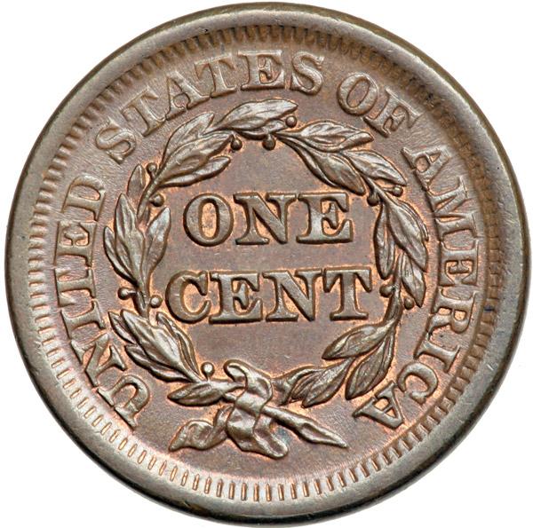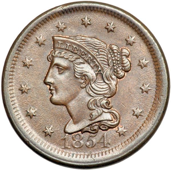 1854 N-11 R2 AU55. Misaligned Dies. Glossy medium brown and chocolate with traces of mint red in protected areas, especially on the reverse. The fields are covered with attractive flowline luster. No spots or stains, a small planchet-cutter crease on the edge over star 6 and a couple tiny pinpricks in the hair over the R in LIBERTY are the notable marks. M-LDS, die state c. The obverse is slightly misaligned to K-12.5 while the reverse is properly centered. DWH #1505.