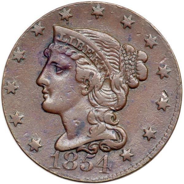 1854 N-11 R2 Cut-down Planchet F15. Sharpness VF20 or slightly better with some light contact marks, including a nick at the top of the ear and another over star 11. Glossy chocolate brown with some reddish chocolate toning at the eye. The planchet is 23.5 millimeters in diameter and weighs only 109.8 grains. Apparently the planchet was carefully cut down to this smaller diameter post-striking (outside the mint) using a precision tool that left the rims looking just like they had been cut this size at the mint (or at the factory making planchets for the mint). Anyway, a neat curiosity. DWH #3389.