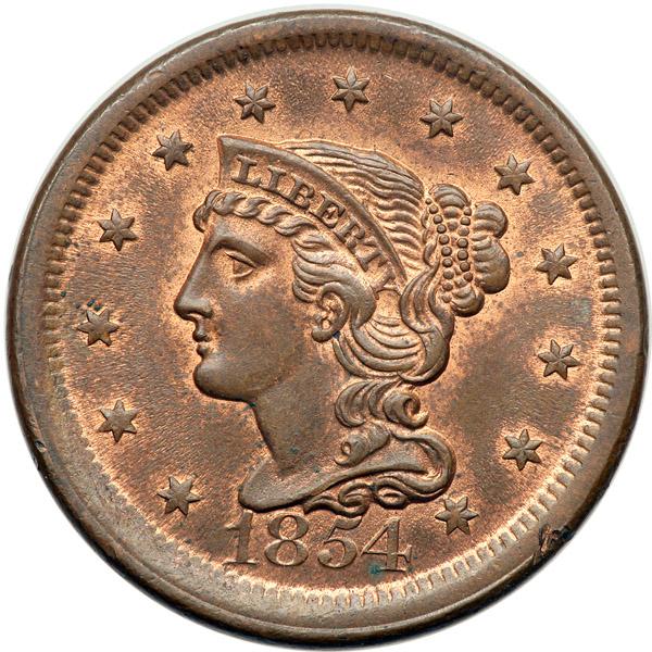 1854 N-11 R2 MS60. Lustrous mint red fading to steel brown, nearly a third of the mint color remaining. This cent is choice except for a small dig on the rim right of star 13 and a couple small spots of darker toning at NT in CENT and under the wreath ribbon. M-LDS, die state c. The fields are covered with radial die flowlines and a flowline connects the right end of the base of the 4 to a dentil below.