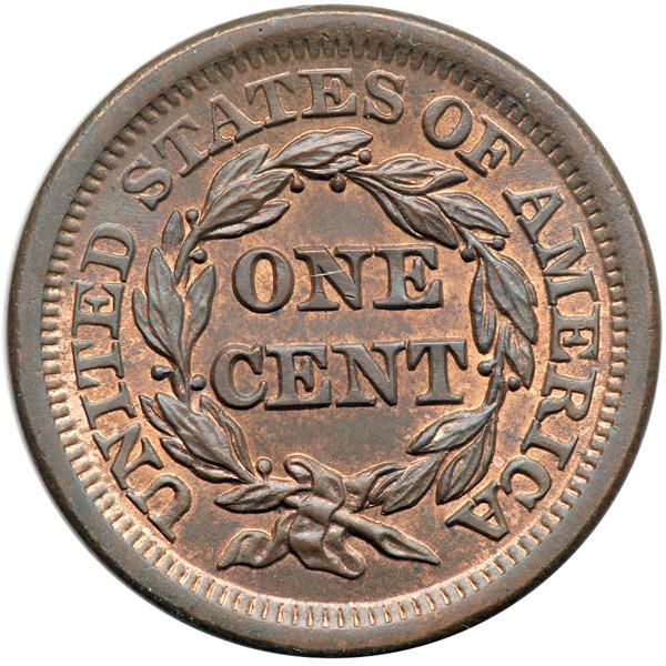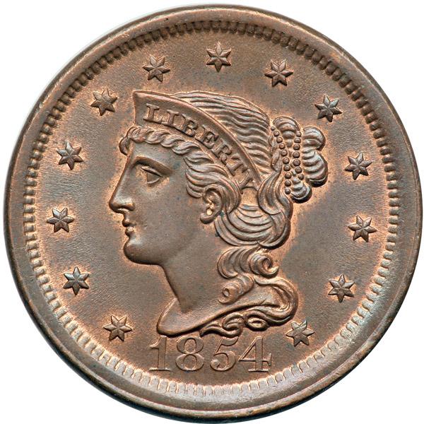 1854 N-11 R2 MS63. Choice lustrous light olive and steel brown with 15% of the mint red remaining. Flawless except for some faint specks of darker toning scattered over the obverse. These tiny spots are not visible without the aid of a good glass and this piece offers outstanding eye appeal for the grade. M-LDS, die state b. Tied for CC#6 in the Grellman census and the finest grades only a single point better.