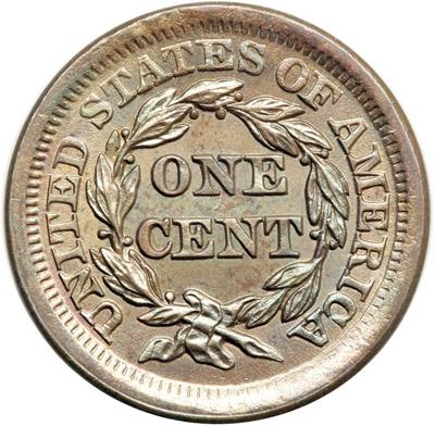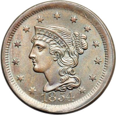 1854 N-11 R2. MS-60 Plus. Lustrous light bluish steel brown with a hint of sea-green in the mix. The satiny mint frost is unbroken and this cent offers outstanding eye appeal for the grade. A choice example except for a spot of very fine carbon on the front edge of the eyeball. This spot is well hidden and is very easy to overlook, but it counts anyway. MDS, die state b. The fields are covered with fine roughness from radial die flowlines caused by die wear. Tied for CC#13 in the Grellman census.