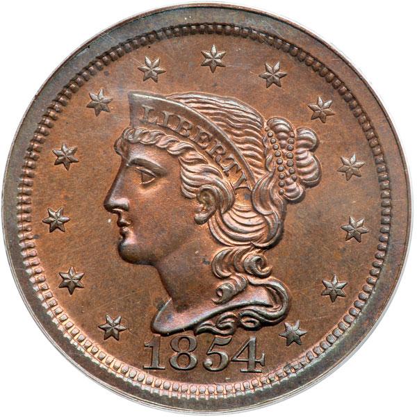 1854 N-12 R6 (as a proof) Repunching Below 1. PCGS graded Proof 64 Red & Brown. Steel brown with delicate hints of bluish steel overtones and faded mint red covering the fields, about 50% remaining on the obverse and 10% on the reverse. The fields are nicely reflective and the mirrors are moderate to deep in spite of some extremely faint hairlines. The only significant defect is a small spot of darker toning on the upper edge of the bust, and this spot is very lightly abraded. The additional identifying marks are a tiny curved struck-through line at the right tip of star 1, a small carbon spot on the rim at ED, and a small nick-like rim chip on the edge at the second T in STATES (as struck). Called Proof-64 and finest known in the Denis Loring census. Our grade is Proof-64, tied for CC#1 honors in the Grellman census of proof strikes. A very attractive large cent and an unquestioned proof strike. And it comes with an impressive list of prior owners. The attribution and Dan Holmes provenance are noted on the PCGS label. PCGS population 2; none finer in Proof Red & Brown at PCGS for the variety. DWH #1870 (PCGS # 400592) .