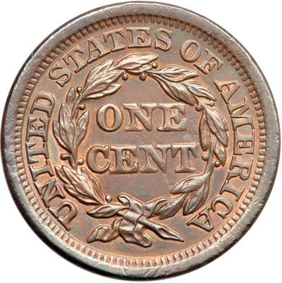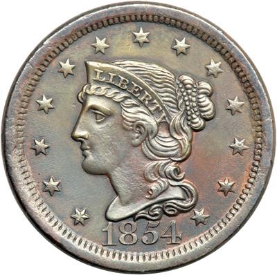 1854 N-13 R4. AU-50. Sharpness near mint state but this cent was lightly cleaned and has been retoned frosty olive and dark steel with traces of mellowed red in protected areas, mostly on the reverse. No spots or stains, and the only notable contact marks are a couple light nicks on the rim at the bottom of the reverse. E-MDS, die state b early. The die lines at S-OF are gone but the line up from the dentils under the right side of the 5 is clear. A shallow low spot covers the neck and most of the cheek, as often found on this variety.