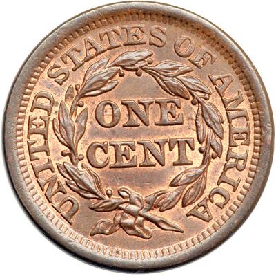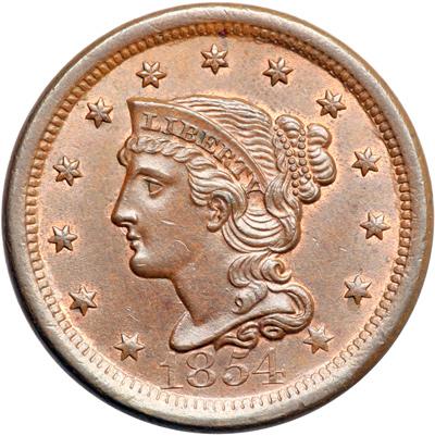1854 N-18 R3+. MS-62. Frosty light chocolate and steel brown with 20% of the mint red remaining, mostly on the reverse. Excellent luster and eye appeal. Just a few trivial marks, including a faint spot of darker toning on the lower point of star 12 and a couple microscopic ticks on the cheek and chin. M-LDS, die state c. The die lines at the E in ONE are gone. Tied for CC#5 in the Grellman census. Removed from an NGC slab graded MS65 Brown (NGC label included).