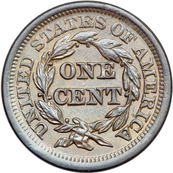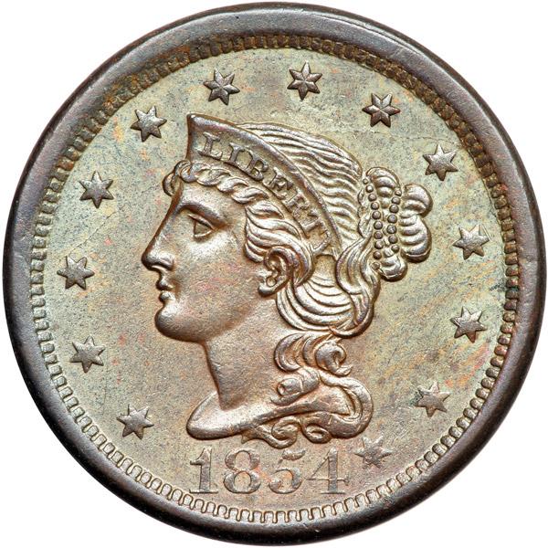1854 N-19 R3 AU50. Mint state sharpness but dipped and retoned frosty chocolate and steel brown changing to lighter steel brown and tan in protected areas. The highpoints are covered with extremely fine granularity while the remainder of the planchet is smooth. E-MDS, die state b early. The bisecting die crack on the obverse is present but very light.