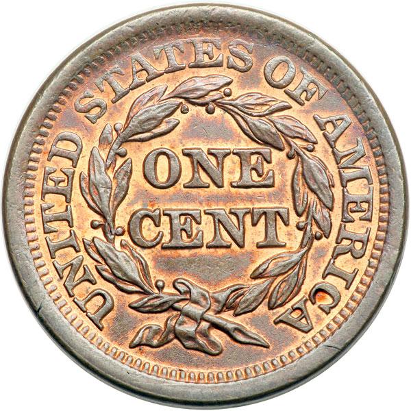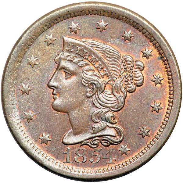 1854 N-19 R3+ MS62. Lustrous bluish steel brown with 10% of the mint color showing on the obverse, a third remaining on the reverse. A choice example if not for a couple minor contact marks, including a thin vertical nick above star 2, a tiny nick close under the chin, and a small spot of dark toning at the dentils right of star 9. A pair of shallow low spots or planchet flakes are located just above the bisecting crack left of star 8, as struck. MDS, die state b. The bisecting obverse die crack is clear but not strong and the reverse is rotated 105 degrees CCW. CC#2 overall but finest of only a very few known with a rotated reverse. Removed from an NGC slab graded MS65BN (NGC label included, and it shows the attribution and Reiver provenance). DWH #3019.